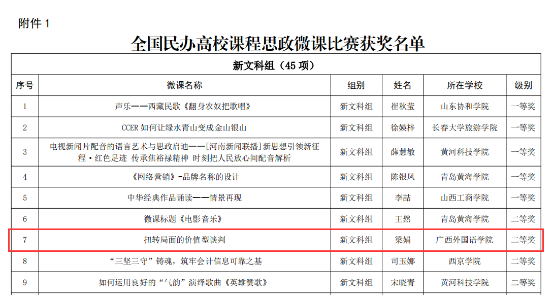 我校高度重视此次比赛,积极组织教师参与,旨在以赛促教,深化课程思政教学改革,提升教师将思政元素融入课堂教学的能力。经学校初赛选拔、全国民办高校课程思政联盟决赛评审,在新文科组比赛中,梁娟老师的作品《扭转局面的价值型谈判》凭借新颖的教学设计、巧妙的思政元素融入,荣获二等奖;陈盈竹老师的作品《“春风”送暖 —— 中日新年文化的和韵交响》以独特的文化视角和深刻的育人内涵,荣获三等奖。