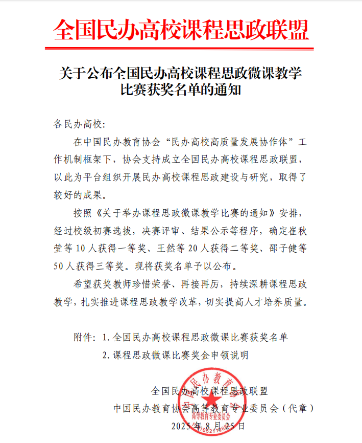 2025年,全国民办高校课程思政联盟公布了课程思政微课教学比赛评选结果,我校教师在此次赛事中喜获佳绩。